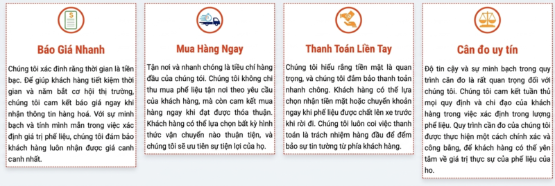 Tất cả những tiêu chí trên cùng nhau tạo nên một trải nghiệm thu mua phế liệu không chỉ hiệu quả mà còn đáng tin cậy và tiết kiệm thời gian cho khách hàng. Chúng tôi cam kết đáp ứng mọi nhu cầu của bạn với sự chuyên nghiệp và tận tâm tối đa.
